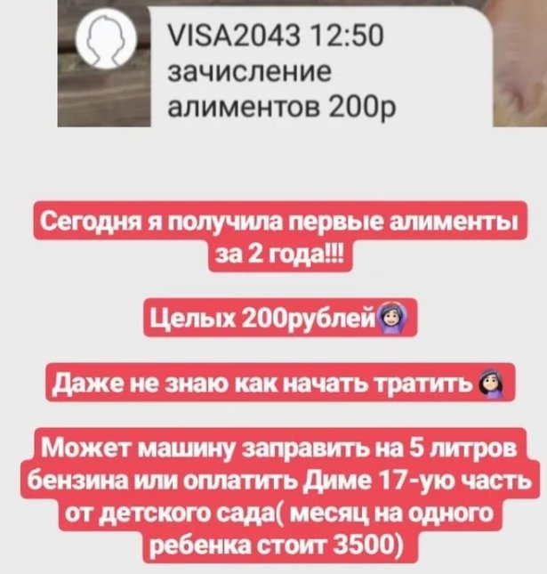 "Даже не знаю, как начать тратить. Может, машину заправить на пять литров бензина или оплатить Диме 17-ю часть от детского сада (месяц на одного ребенка стоит 3500)", — написала она в stories Instagram.