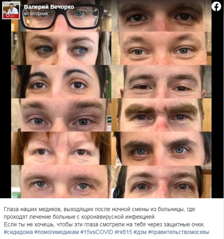 В соцсетях появилась фотография врачей московской клинической больницы №15, где проходят лечение больные коронавирусной инфекцией. Главврач больницы Валерий Вечорко в Facebook показал снимок с глазами медиков.
