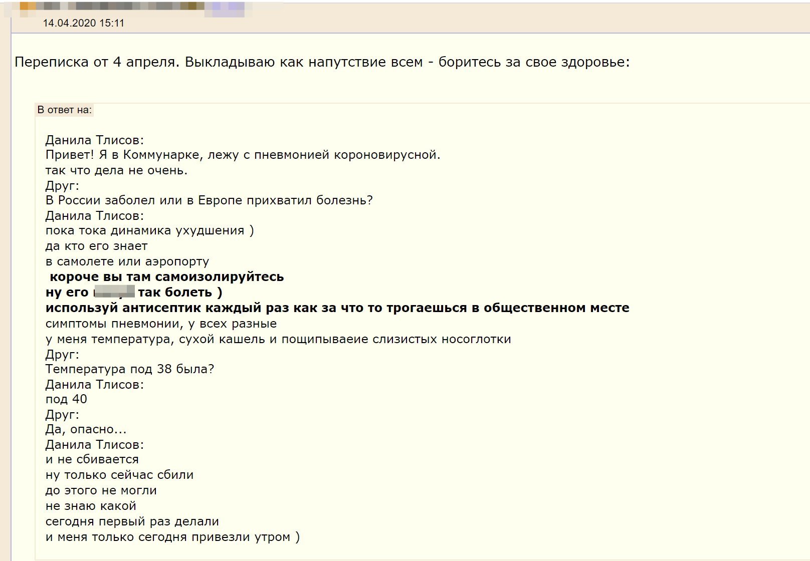 В Коммунарке от коронавируса скончался 37-летний Данила Тлисов, перспективный физик-ядерщик. Он был госпитализирован в начале апреля, а после его смерти знакомые выложили в Сеть их переписку с Тлисовым. Она оставляет пугающее впечатление, так как его состояние было чрезвычайно тяжелым.