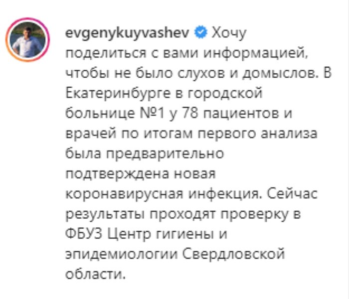 «В Екатеринбурге в городской больнице № 1 у 78 пациентов и врачей по итогам первого анализа была предварительно подтверждена новая коронавирусная инфекция. Сейчас результаты проходят проверку в ФБУЗ „Центр гигиены и эпидемиологии в Свердловской области», — написал глава региона в Instagram.