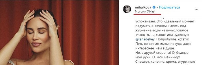 Однако внимание подписчиков артистки привлекли не ее фантазии на тему мытья посуды, и даже не фотография, где она позирует непохожая на себя в белой сорочке, напоминающей на ночнушку, а геоловкация — Московская область.