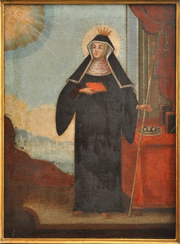 На иконах святая изображена с псом, который символизирует проводника в потусторонний мир, и треугольным зеркалом, в котором можно увидеть будущее.