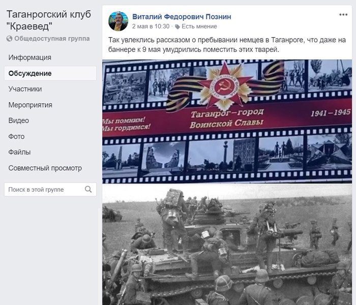 В городе воинской славе Таганроге местная администрация незадолго до 9 Мая вывесила плакат с поздравлениями с Днем Победы, на котором размешена фотография немецких карателей.