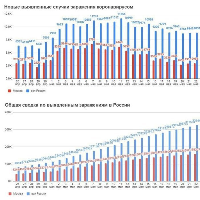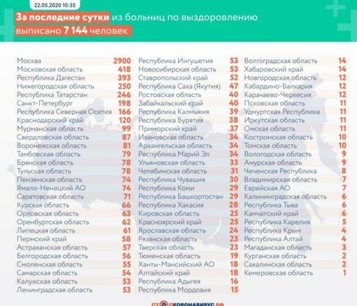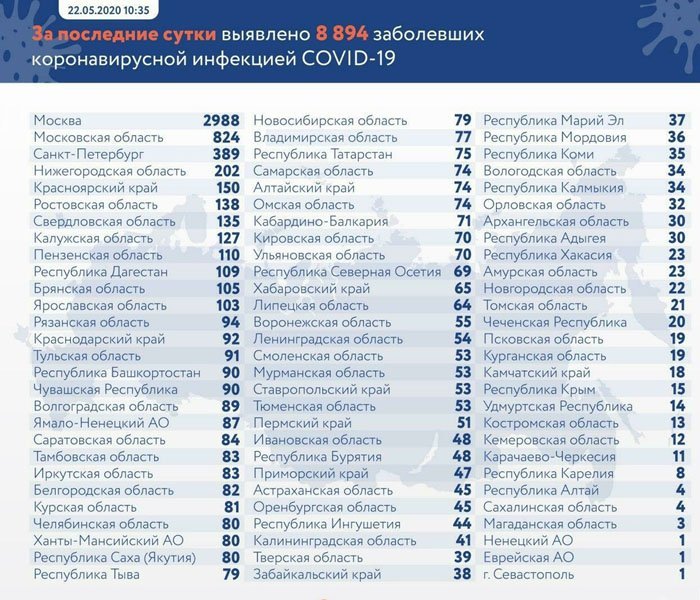 На утро 22 мая в России зафиксировали 8 894 новых случая заболевания, сообщил федеральный оперативный штаб по коронавирусу. За сутки умерли 150 человек человек с подтвержденным диагнозом коронавирусная инфекция — рекордное число с момента начала эпидемии.