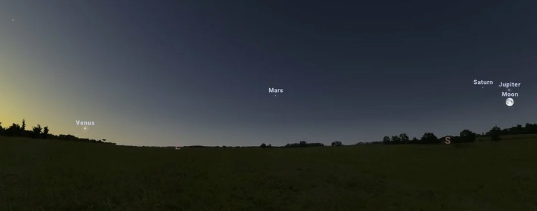 Планеты-гиганты Юпитер и Сатурн можно наблюдать с полуночи, Марс — с 2:00, а Венеру — в предрассветные часы. При этом до 14 июля видимость Сатурна и Юпитера будет улучшаться, поскольку они войдут в противостояние с Солнцем и будут хорошо отражать излучение звезды. Все четыре планеты можно разглядеть невооружённым глазом в восточной части неба.