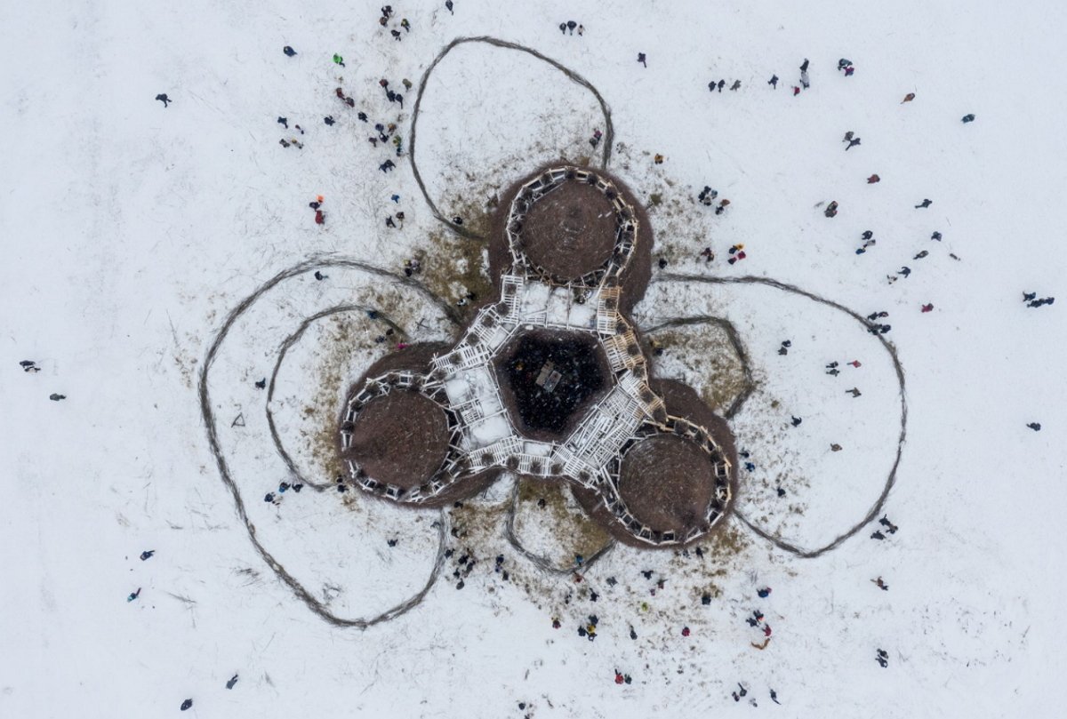Однако на этом необычные способы проводом зимы в России не завершились. Так, в известном арт-парке под Калугой Никола-Ленивец темой Масленицы стала пандемия по коронавирусу.