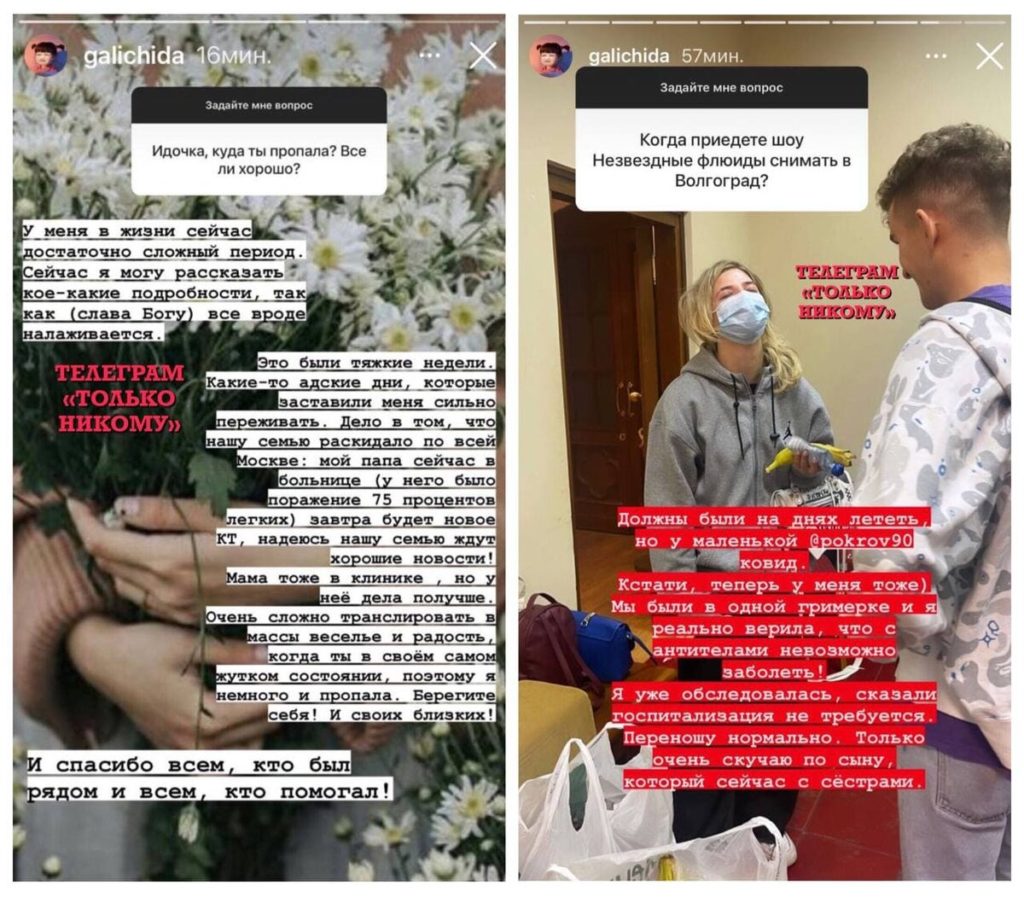 Отвечая на вопросы поклонников в «сторис» Ида Галич сообщила, что не может пока ездить на съемки. Поэтому ее не стоит ждать в Волгограде, где она собиралась снимать «Незвездные флюиды».