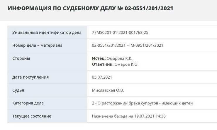 Как пишет СтарХит, иск поступил в мировой участок. Судья только решит вопрос с разводом. Иск о взыскании алиментов, разделе имущества поступить должен на судебных участках. В документах Бородиной и Омарова эти вопросы не значатся, подчеркнули в суде.