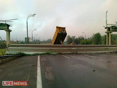 Крупное ЧП, полностью заблокировавшее движение по федеральной трассе произошло около 4 часов утра на 22-ом километре автодороги. Водитель грузовика забыл опустить откидной кузов и снес наземный пешеходный переход, в результате чего конструкция рухнула на кабину.