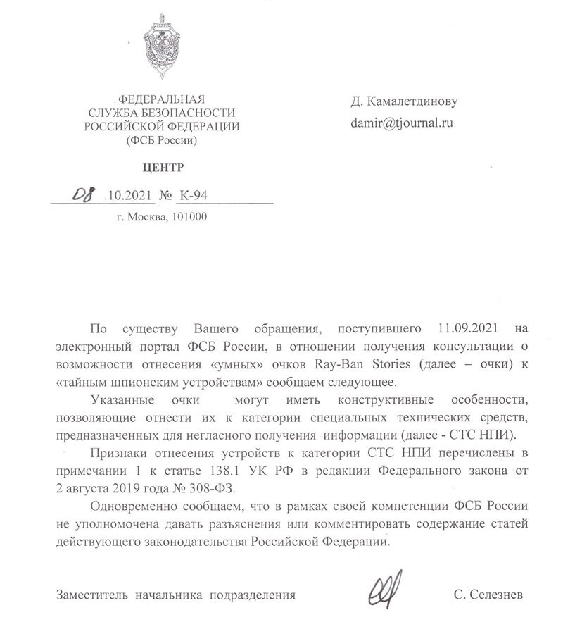 Как сообщает издание TJ, которое направило запрос в ведомство, в ответе сообщается, что по ряду технических характеристик устройство может попасть в разряд так называемых шпионских устройством.