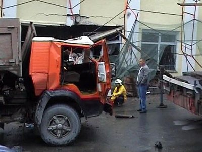 Удар большегруза пришелся на стену одной из трех мастерских, расположенных на первом этаже. «КамАЗ» вынес часть стены с двумя оконными проемами.