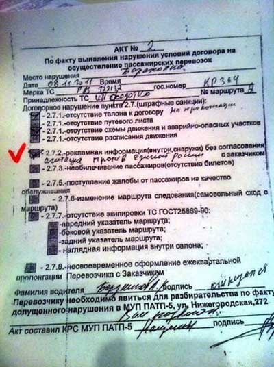 В списке нарушений, допущенных владельцами маршрутки, помимо «отсутствия талона к договору» и «отсутствия схемы движения и аварийно-опасных участков» обозначена «рекламная информация без согласования с заказчиком». Причем в этой графе от руки вписано: «агитация против «Единой России».