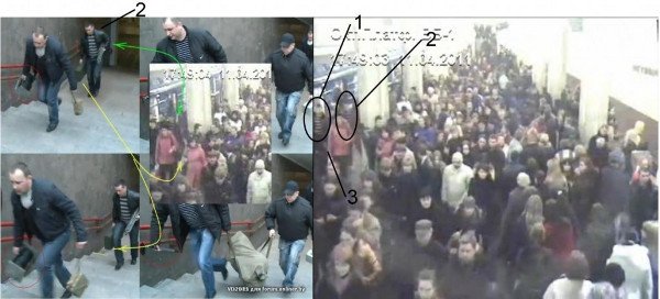 На видео с камер наблюдения также видно, что двое мужчин крепкого телосложения в таких же чёрных куртках и свитерах в чёрно-белую полоску, как и у тех, кто выносил с «Октябрьской» саперное оборудование, несколькими минутами ранее были запечатлены в непосредственной близости места, где и произошел взрыв.