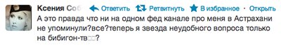 Подвела Ксения так же и фраза, брошенная в "Твиттер": "Правда что ни на одном фед канале меня в Астрахани не упомИнули?"