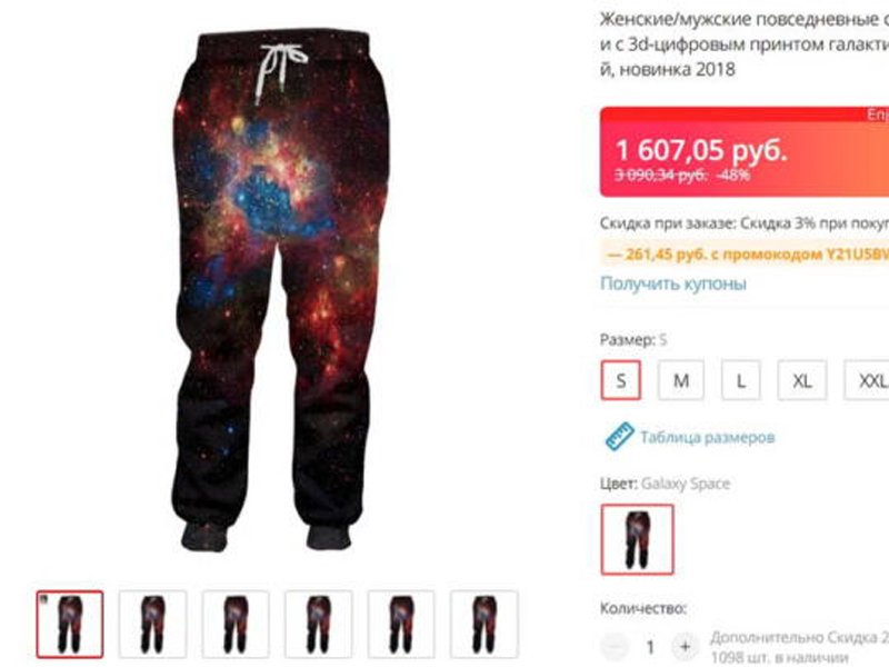 К примеру за костюм, украшенный «галактическим» принтом, авторы просят 30 000 рублей.