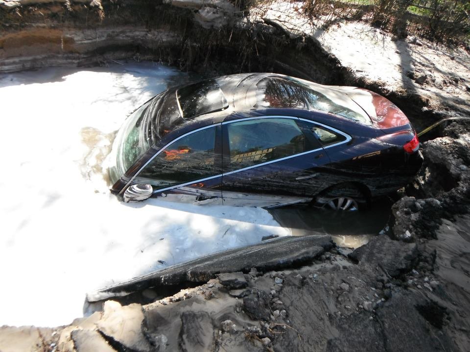 Когда Лена выбежала на улицу, передние колеса машины уже находились в воде. Проезжающие мимо водители не захотели помочь находящейся на 8 месяце беременности девушке и вытянуть автомобиль тросом, поскольку опасались, что и их машины смогут угодить в провал.