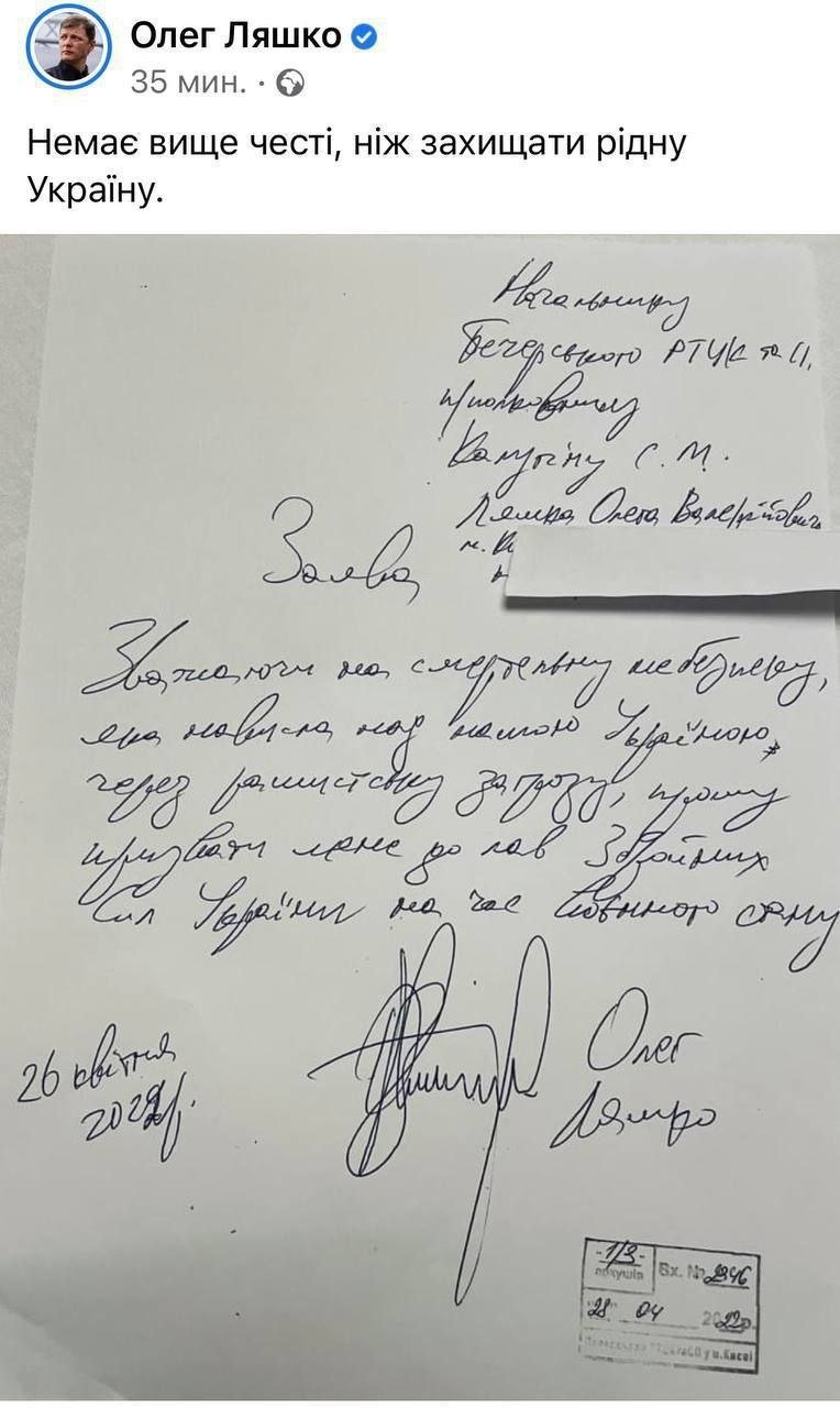 В апреле 2022 года появилось фото заявления Ляшко на вступление в ряды ВСУ.