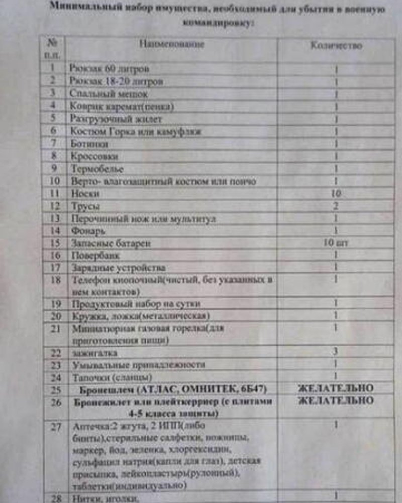 Также говорится о списках вещей, которые военные должны купить самостоятельно, и в который входят теплая одежда, сухпайки, камуфляж, бронежилеты и шлемы.