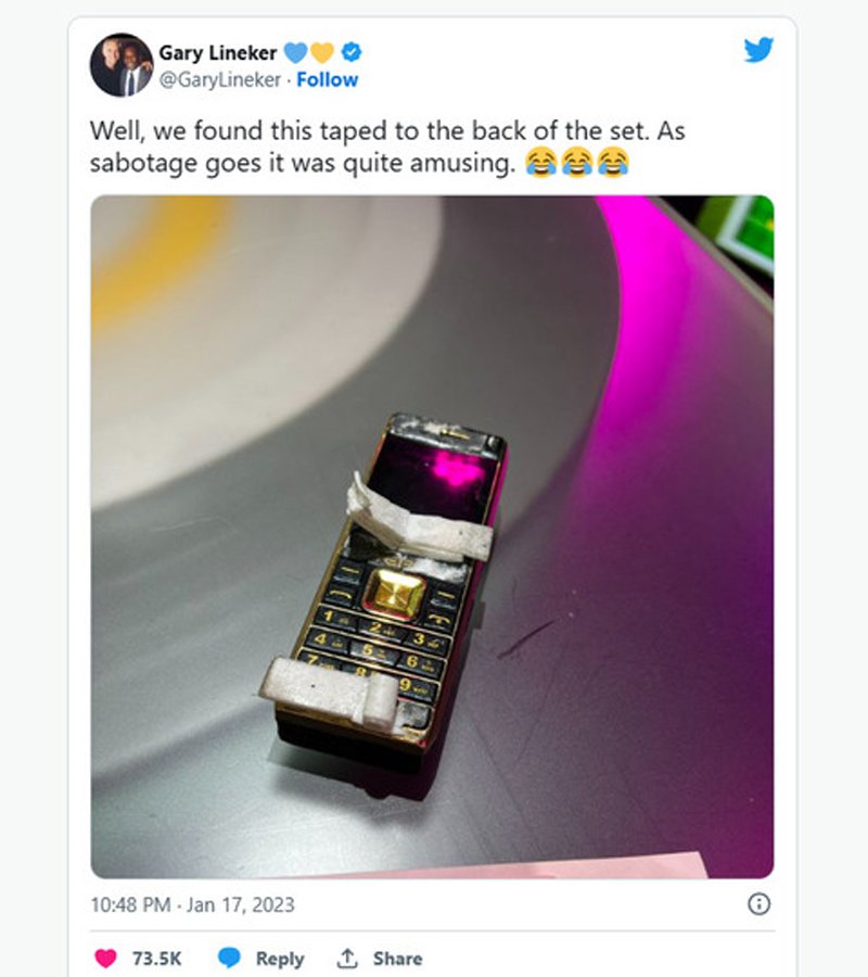 Причину инцидента установили по горячим следам. Фото телефона, который был приклеен к задней части телевизора, опубликовал в своем аккаунте Линнекер. Он пояснил, что это «саботаж» и что случившееся «было довольно забавно».