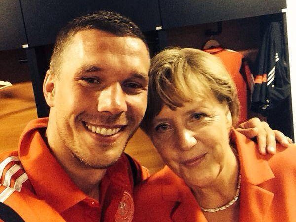 Нападающий немецкой сборной по футболу Лукас Подольски сделал селфи с канцлером Германии Ангелой Меркель.