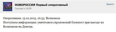 Такая же версия подтверждается тем, что в паблике «НОВОРОССИЯ Первый оперативный» днем 13 января появилось сообщение об удачном артиллерийском ударе сепаратистов по украинскому блокпосту под Волновахой. Позже оно было отредактировано, но пользователи успели сохранить скриншоты: