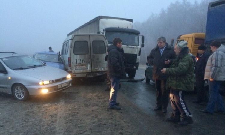 Причиной столь крупного дорожного происшествия стали гололед и сильный туман. Первыми в низине с плохой видимостью столкнулись два большегрузных автомобиля, а остальные водители, не видя столкновения, влетали в уже стоящие машины. При этом видимость на том участке автодороги составляла около 2-3 метров, уточняет LifeNews.