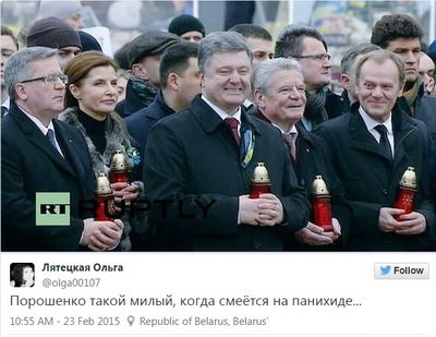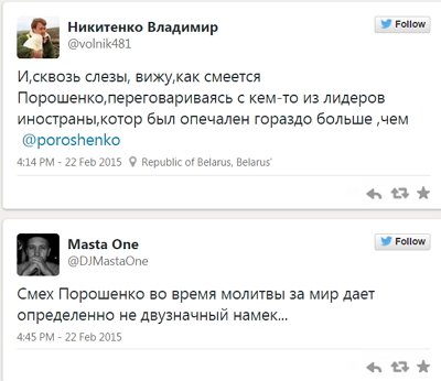 «И, сквозь слезы, вижу, как смеется Порошенко, переговариваясь с кем-то из лидеров иностранных, который был опечален гораздо больше, чем он», — пишет Владимир Никитенко в Twitter. «Смех Порошенко во время молитвы за мир дает определенно не двузначный намек…», — добавляет Masta One.
