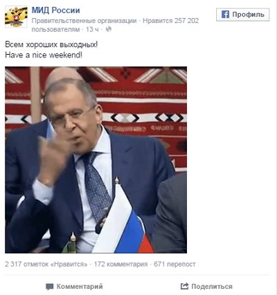 Министерство иностранных дел России на своей странице в Facebook опубликовало coub-видео с Сергеем Лавровым в главной роли, пишет «Газета.Ru».
