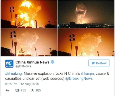 Один из госканалов в своем микроблоге сообщил, что взрыв произошел в 23:30 по местному времени на причале района Биньхай. Также уточнялось, произошло два мощных взрыва с промежутком в 30 секунд, к месту происшествия съезжаются машины "скорой помощи".