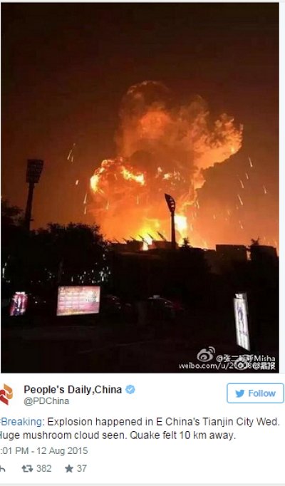 Стоит отметить, чтокитайские власти рекомендовали населению не выходить на улицу и держаться подальше от места взрыва.