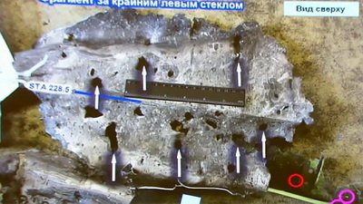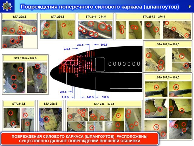 Концерн представил реконструкцию пробития фрагментов пола кабины пилотов. Она также свидетельствует о том, что поражающие элементы двигались вдоль конструкции самолета. Осколок, который пришел в штурвал командира экипажа, не мог пройти с левого борта, что случилось бы, если бы ракета была пущена из Снежного, заявил Малышевский. Левый двигатель находился в основном поле накрытия осколками.