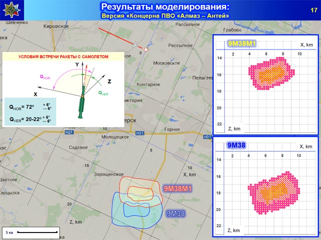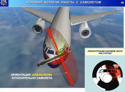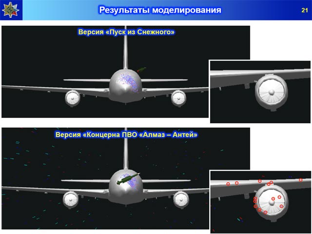 Эксперты произвели трехмерное моделирование. Результаты эксперимента показали, что при пуске ракеты из Снежного (версия международной группы расследования под руководством Нидерландов) ни один поражающий элемент попасть в двигатель самолета не мог.