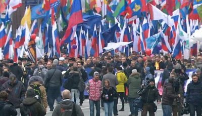 В первых рядах колонны следуют представители традиционный российских конфессий. В акции принимают участие активисты Московской Федерации профсоюзов, различных политических партий и общественных организаций. Демонстранты, среди которых много студентов, несут плакаты: "Все за Россию, Россия за всех!", "За единство от Камчатки до Крыма", "Когда мы едины — мы непобедимы!".