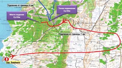 На изображении видно, что российский бомбардировщик (его путь обозначен красным цветом), вылетев с базы Хмеймим, через некоторое время совершил манёвр и пролетел на удалении в один километр от границы с Турцией. Когда он уже удалился от границы, турецкий F-16 (путь обозначен синим цветом) настиг его в воздушном пространстве Сирии неподалёку от границы и сбил ракетой. После чего развернулся и скрылся в Турции.
