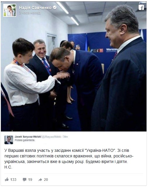 В своем Facebook помилованная украинская военнослужащая рассказала, что приняла участие в заседании комиссии Украина — НАТО в Варшаве. Савченко заявила, что со слов первых мировых политиков у нее сложилось впечатление об окончании войны на юго-востоке Украины уже в этом году.