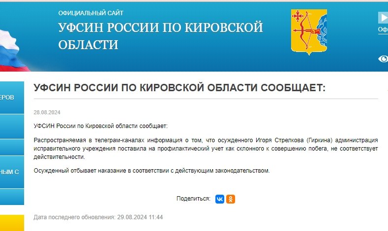 После информации от Регинской, УФСИН по Кировской области опубликовала опровержение. По их данным, информация об учете Стрелкова как склонного к побегу не соответствует действительности. В УФСИН заявили, что осужденный отбывает наказание в соответствии с действующим законодательством.