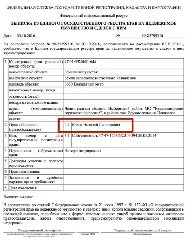 Согласно документу Николаю Владимировичу Козикову принадлежит земельный участок площадью 6,6 тыс. кв. м. При этом ФБК отмечает, что имя, фамилия и отчество полностью совпадают с данными заместителя начальника пограничной службы ФСБ России, отвечающего за охрану госграницы.