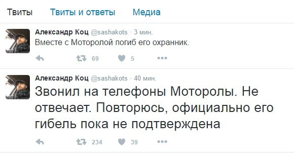 В свою очередь, уполномоченный по правам человека в ДНР Дарья Морозова назвала смерть Моторолы огромной трагедией и выразила соболезнования его родным и близким.