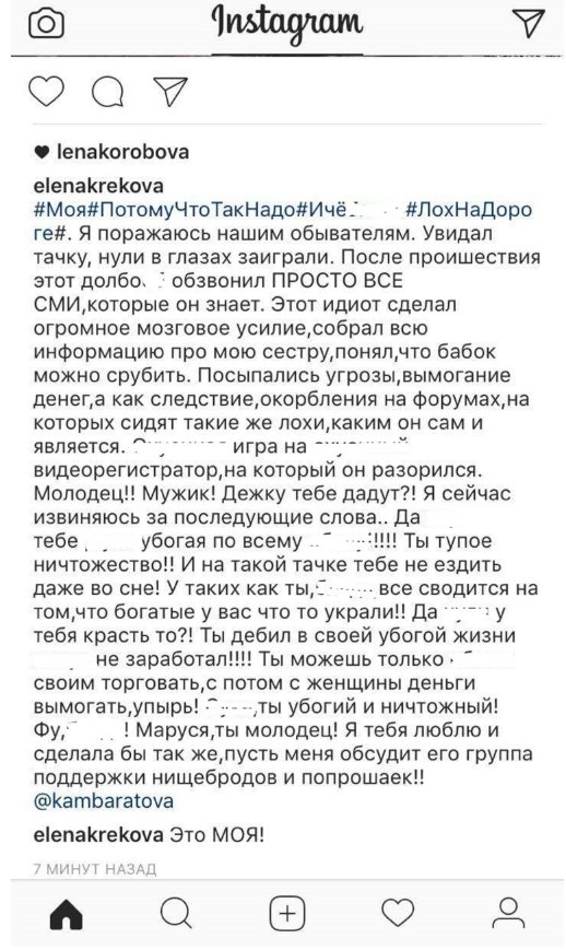 Родственники заступились за дочь депутата Марину Камбаратову, устроившую разборки на дороге, о которых писал ранее TopNews. Так, сестра девушки Елена Крекова опубликовала гневное сообщение, в котором активно использовала мат и переходила на личные оскорбления.