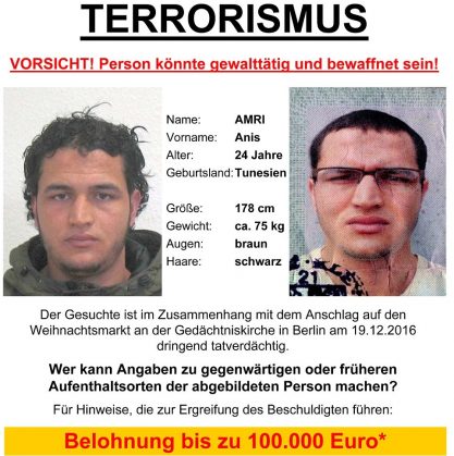 Немецкая полиция разыскивает 23-летнего уроженца Туниса Аниса Амри по подозрению в совершении теракта 19 декабря на рождественской ярмарке в Берлине. Молодой человек подходит под описание злоумышленника, который скрылся с места преступления, а под сиденьем в угнанном грузовике с польскими номерами, который врезался в толпу людей на Рождественской ярмарке, было найдено одно из его удостоверений личности, выданное два года назад.