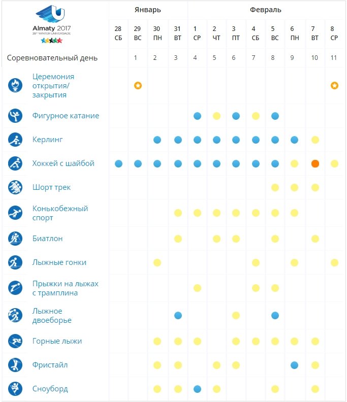 Также расписание соревнований приведено на официальном сайте Универсиады 2017 в Алматы.