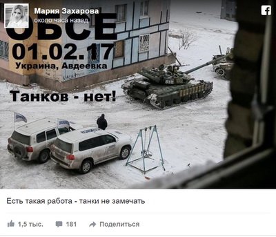 «Есть такая работа — танки не замечать», — написала Захарова на своей странице в Facebook, комментируя опубликованное российским журналистом Александром Коцем фото, на котором автомобили миссии ОБСЕ стоят рядом с украинскими танками около жилых домов в Авдеевке.