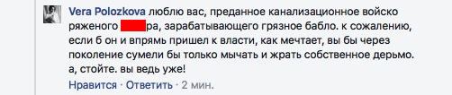 "Ваши стихи мне нравились. Но теперь я знаю, что все это только слова! Свое гуманное и человеколюбивое заявление Полозкова опубликовала в Фейсбуке", "Весьма разочарован. Раньше Полозкову считал умной и тонкой натурой. А сейчас считаю, чтобы было бы правильно отправить ее за решетку за вышеобозначенный пост", "Отписываюсь от группы фашистки", "Полозкова, ты подписала себе приговор", "Нет ее для меня больше", "Полозкова, ты мразина, вот ты кто", — отметили разочарованные поклонники.