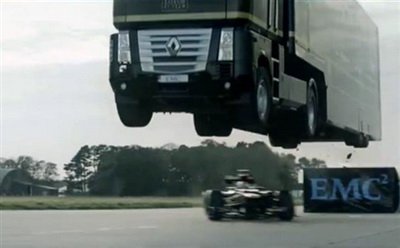 Во время прыжка под грузовиком проехал болид команды "Формулы-1" Lotus, за рулем которого находился российский каскадер Мартин Иванов, прославившийся автотрюками в кино.