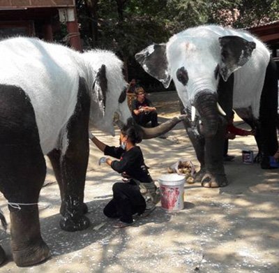 Сотрудники слоновьего заповедника в рамках выставки «1600 панд» перекрасили троих своих животных.