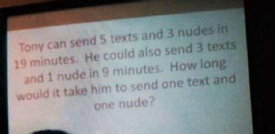 Недовольство вызвала следующая задача: «Тони может за 19 минут отправить пять SMS и три обнаженных фото. За девять минут он отправляет три SMS и одно обнаженное фото. Сколько ему понадобится времени, чтобы отправить одно SMS и одно обнаженное фото?»