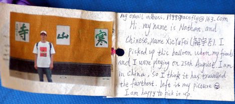 Она была поражена, когда мальчик по имени Хи Ю Фей из Китая написал ей письмо и признался, что нашел именно ее шарик. 13-летний школьник бродил вместе с друзьями по родному городу, когда увидел его на улице, в провинции Гуанчжоу.