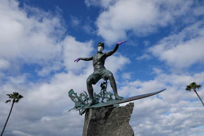 Памятник калифорнийскому серфингисту в Энсинитасе (США) тоже напоминает прохожим о пандемии коронавируса.