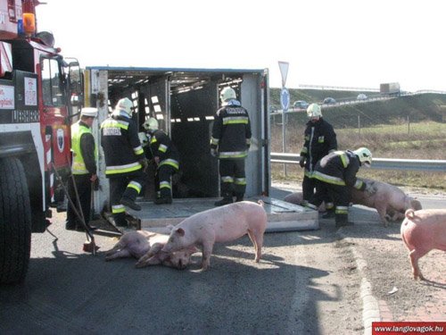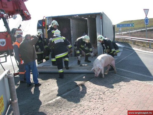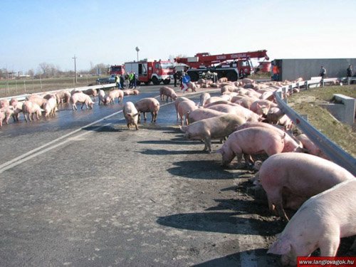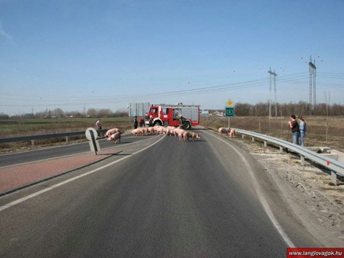 Сегодня федеральную трассу в Венгрии заполнили поросята, которых перевозили в грузовике. Пока спасатели и милиция, которых вызвали очевидцы происшествия, разбирались в ситуации, хрюшки разбежались по дороге на много метров вперед, наслаждаясь данной им свободой.