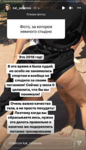 «В это время я была худой, но особо не занималась спортом и вообще не следила за своим питанием! Сейчас у меня ноль целлюлита, чтобы вы понимали!» — написала Сафарова своим подписчикам.